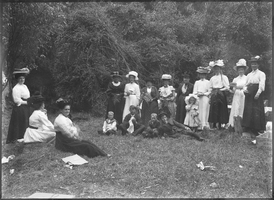 This photograph was created by William James Young in the early 20th century. A large variety of subjects are depicted in the collection, but family, rural life and travel are the most prominent themes. The exact location of the photographs in the Young Collection is unknown, but W J Young lived on a farm in Mt Stewart, Rangitikei, and some of the photographs include his house. The Young family were apparently avid travellers and photographs later in the collection feature scenes from Rotorua, Auckland, Whanganui, as well as other unidentified locations. The portraits are all unidentified, but are presumably of members of the Young family. The photographers parents were George Henry (b 1833) and Jane McDowell (b 1842, d 1916). They came to New Zealand in 1877. The same year, they bought the home farm on Mt Stewart and called it Kilrudden after Kilrudden House, the home of the McDowell family in Ireland. The couple had four children: Ann (b 1873), Margaret (b 1876), John (b 1878) and William James (b 1880). William James married Mary Elizabeth Thompson and they had four children: Doris (b 1914, d 1989), George (b 1916, d 1991), Royden McDowell (b 1925, d 1992) and Noel William (b 1927, d 2013).