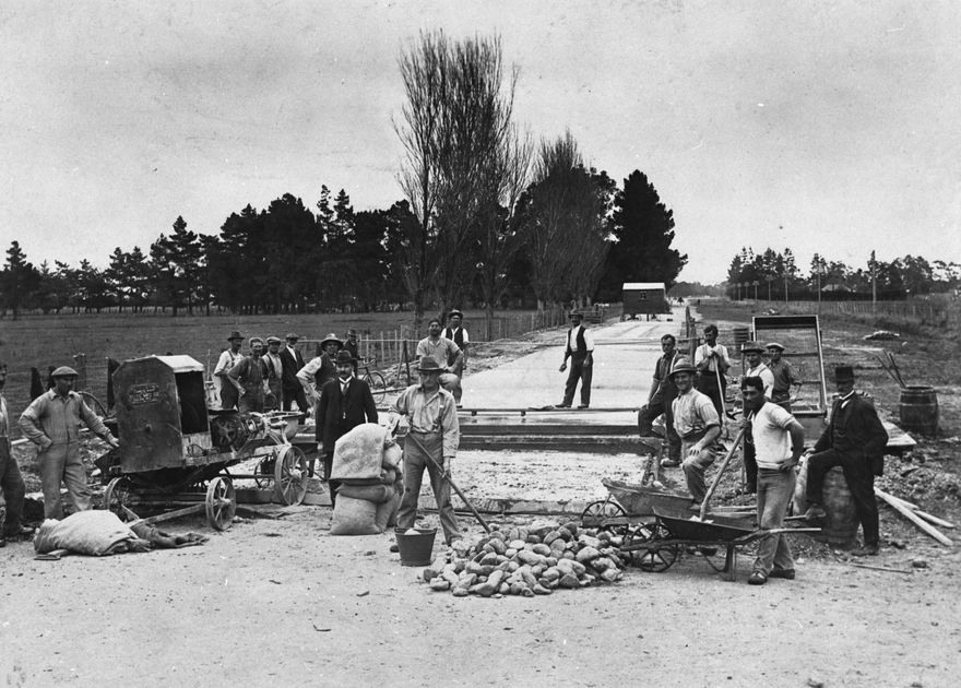 Looking west to the Mangaone Stream workmen lay a concrete road on Rangitikei Line, near the corner of Boundary Road (now Tremaine Avenue). The railway now passes through the centre of this site and the concrete road has been replaced by the approach to the railway ramp. From left: unknown x3; Frank Cahill (pipe in mouth); Tom Kilpatrick (holding bucket); unknown x2; Arthur Hopwood (standing alongside cement bags); unknown (with bicycle in rear); unknown (with shovel in front); Ted Henry (hand on hip); George Check (rear); Harry Mouldey (in centre of concrete strip); Loyal Craw (with one foot on concrete strip); Dick Moxon (with foot on wheel barrow); Dave Craw (with hands on shovel); Ahi Tapu (in front with shovel); unknown x2; George Craw (far right).