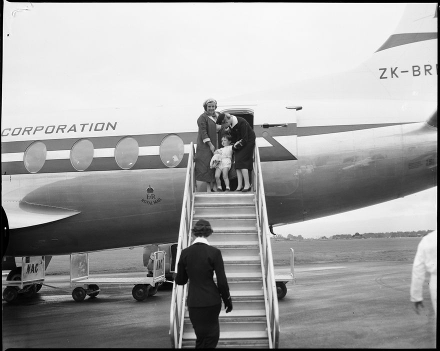 This image was taken for a story that ran in The Manawatu Evening Standard on 6 April, 1959. "First off the Viscount when it arrived on its inaugural flight from Harewood this afternoon at Milson Airport was two-year-old Aubrey Altken, from Dunedin, seen being assisted by his mother and a flight hostess".