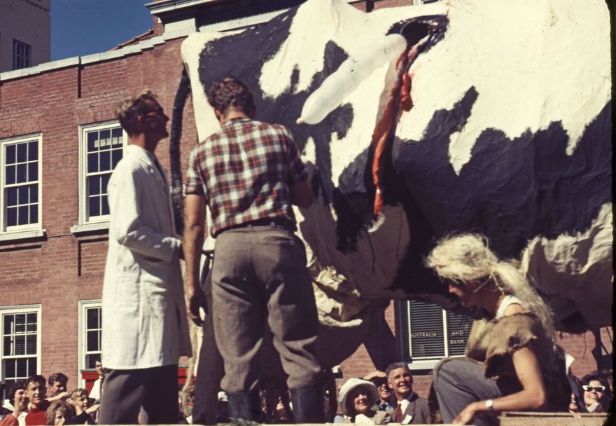 The annual Student procession or 'Procesh' was held at midday on the Monday of 'Capping Week' and was a highlight of 'Town and Gown' relations between Massey University and the City. Sometimes courting controversy with its 'student humour', the parade usually consisted of floats commenting on the issues of the year, clowns and trick cyclists. It attracted large crowds, stopping traffic along Broadway and around the Square and usually ended with a ceremonial ducking in the Butterfly pond after speeches by students representing 'Lord and Lady Massey' and the Mayor.