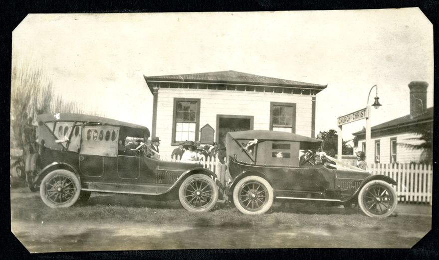 The cars used at the marriage of Clara Sutton to Stan Hooker, outside the Church of Christ, Matheson Street, Wanganui.