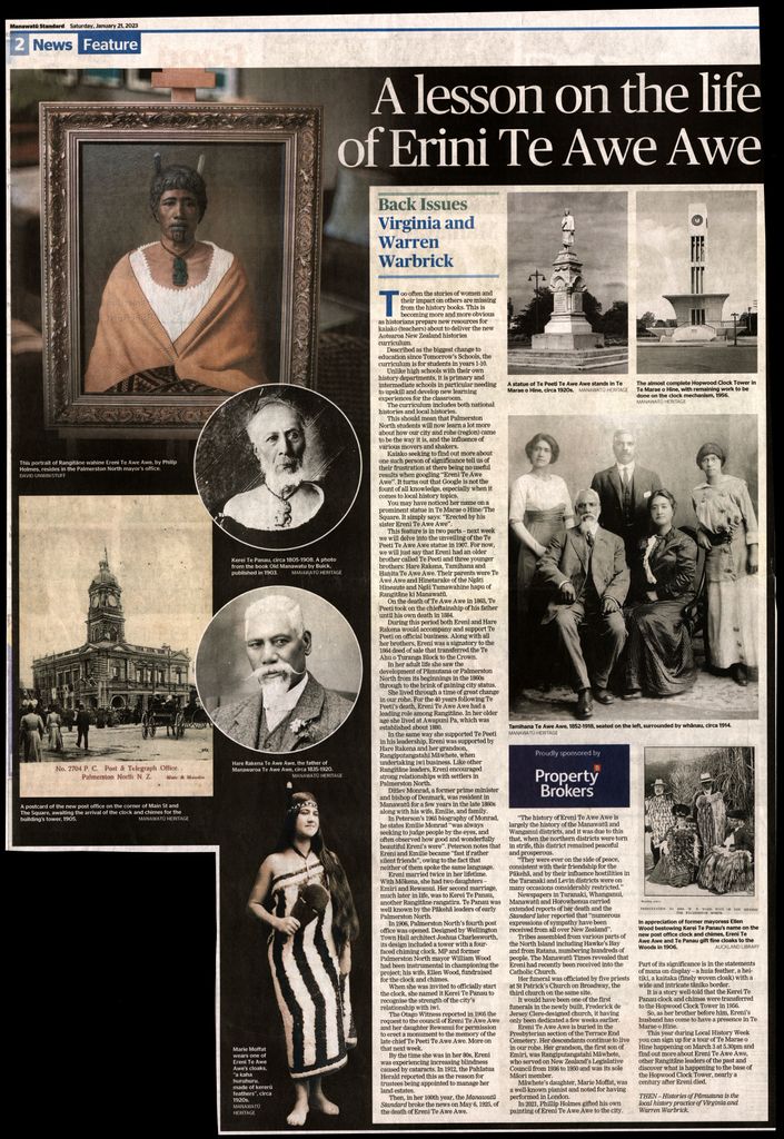 Local historians weekly "Back Issues" article in the Manawatū Standard. The life story of Rangitāne wahine Erini Te Awe Awe, circa 1826-1925.