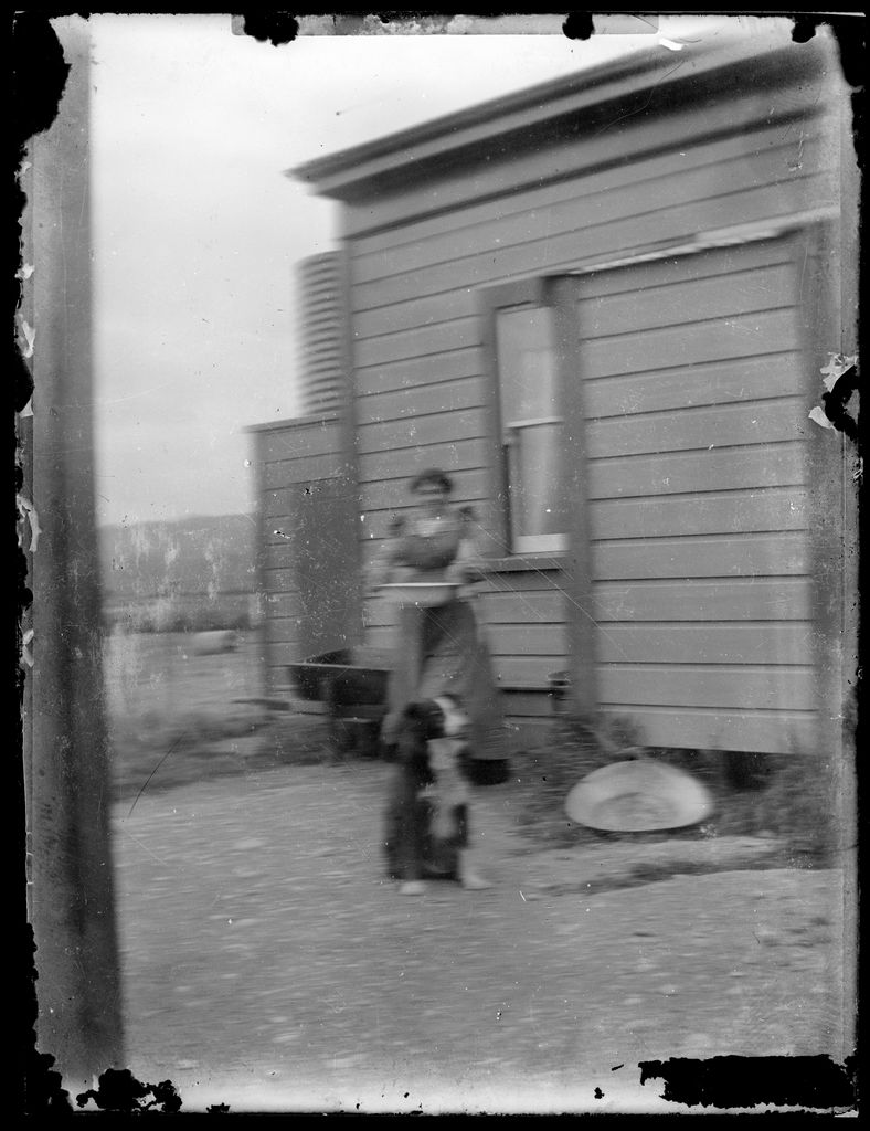 This image comes from a collection of glass negatives found in the attic of 'Lovelock's cottage' by 'Keebles Farm' near Massey University. The people in the images are possibly the Lovelock family, but their identities have not been confirmed.