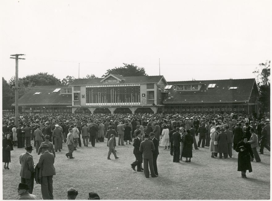 This photograph shows a large crowd outside the main totalisator building (TAB) at a winter meeting at the Awapuni Racecourse. The decision to begin race meetings in Palmerston North was made at a meeting of sportsmen in October 1880. D H McArthur was to be President. The first race couse was situated at the end of Park Road and met there from July 1883 until 1903 when the Awapuni Race course was brought into commission (due to erosion at the previous site). A branch railway was laid in 1905 to carry patrons from Palmerston North to the race course.
