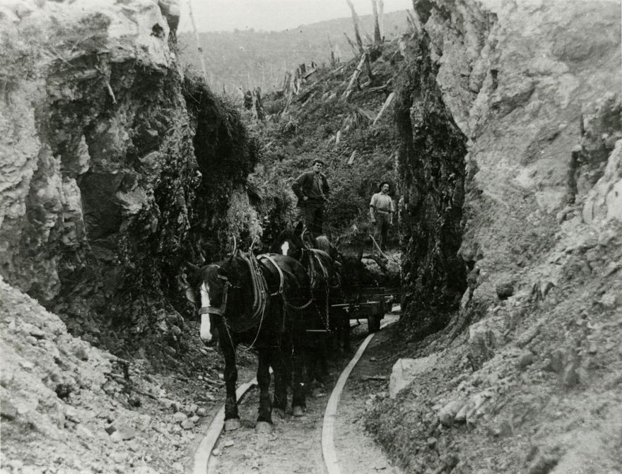 Shown here is a horse team pulling logs through a cutting on the tram track to McGregor's Mill at Moturimu.