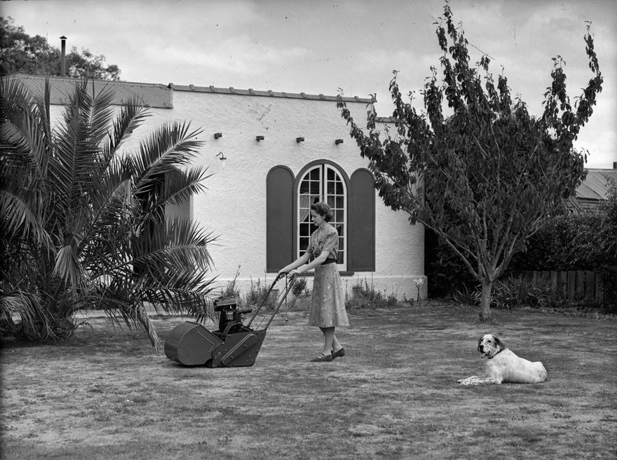 A woman demonstrates the use of a lawn mower, with a dog sitting nearby.