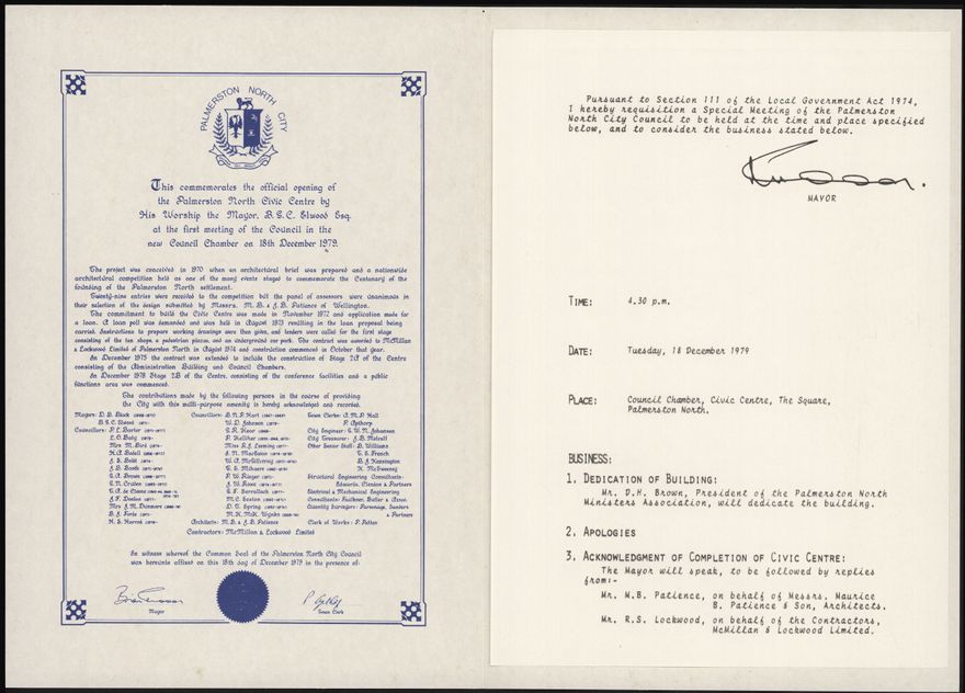 Notice and Order papers for Special Council meeting to be held to acknowledge the opening of the Palmerston North Civic Centre.