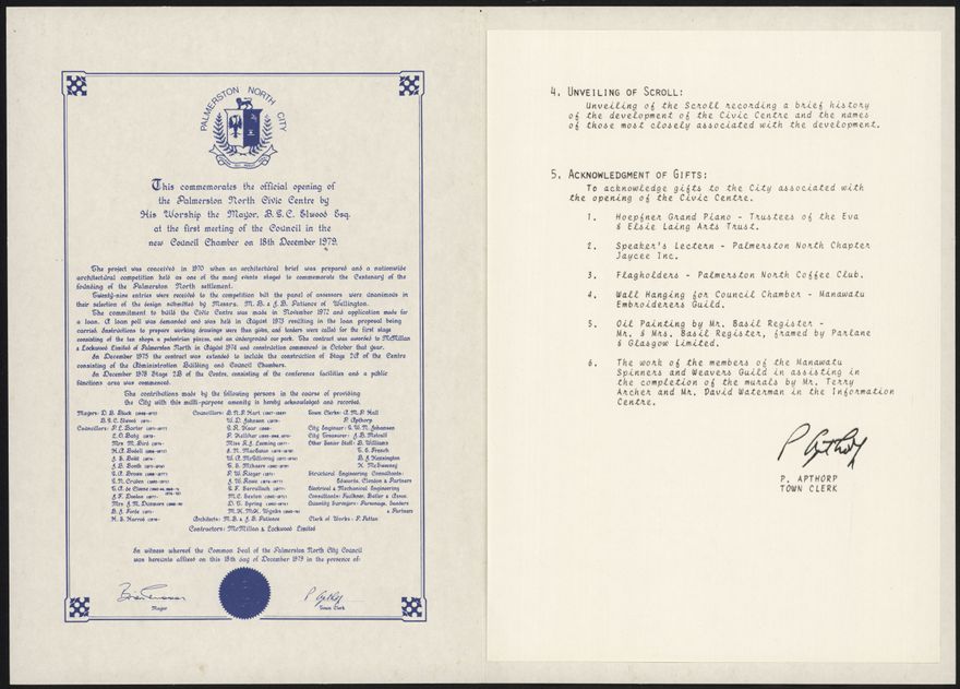 Notice and Order papers for Special Council meeting to be held to acknowledge the opening of the Palmerston North Civic Centre.
