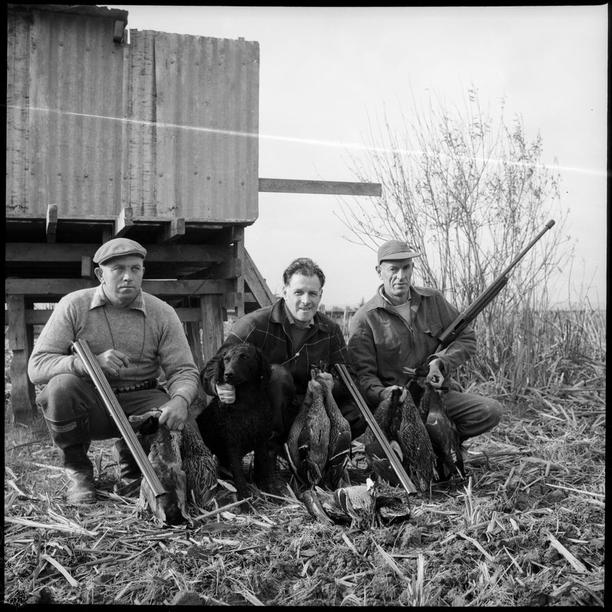 This image was taken for a story that ran in The Manawatu Evening Standard on 4 May, 1963. "Aorangi proved to be a good spot for ducks when the duck shooting season opened today for these three men and their dog. After shooting their first bird at 6:30 a.m., the men returned with 15 ducks. They are (from the left): Messers A. A. Thompson, W. E. Warner and G. Stubbs, all of Palmerston North. The dog's name is Ralph."