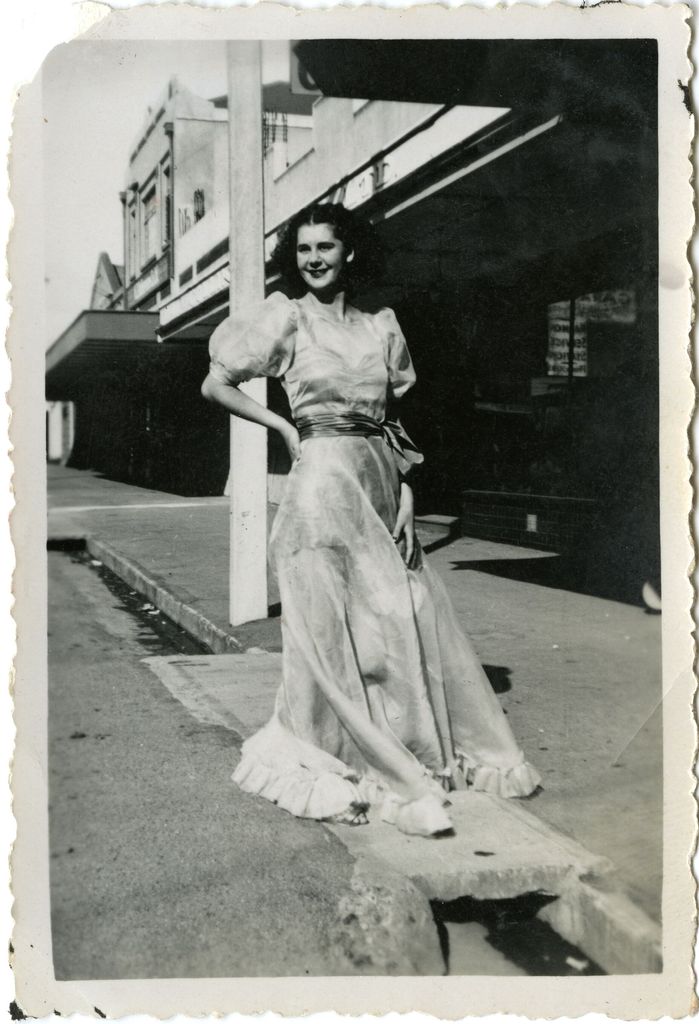 Joan Klee is dressed in an outfit she created for the Palmerston North Diamond Jubilee Parade. It caused quite the stir at the time because of its transparent bottom half. She was a window-dresser for the department store Collinson and Cunninghame, thought to be the first qualified female window-dresser in the country. She was instructed in the art of window-dressing by Claude Dixon, who had traveled to the United States to study at the prestigious Macy's Department Store. Joan Klee married Kenneth Lindsey McDonald.