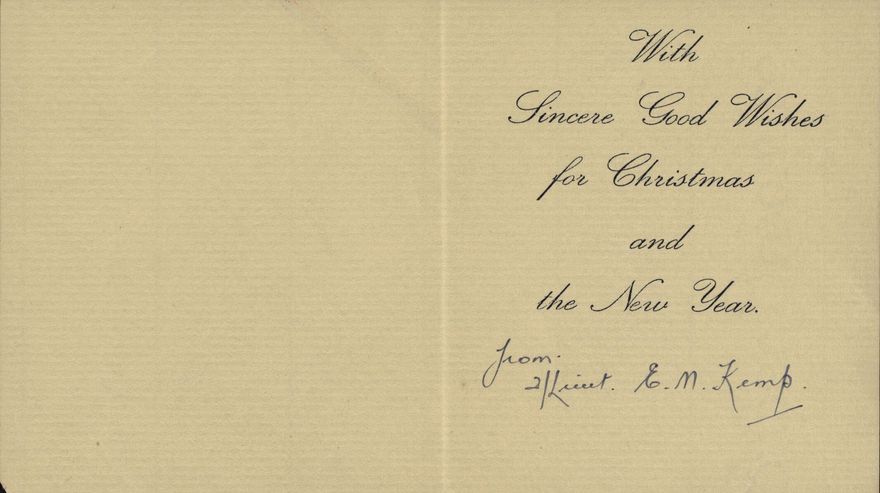 Christmas card sent to the Palmerston North branch of the Women's War Service Auxiliary, from the 2nd Field Regiment of the New Zealand Army. Signed by 2nd Lieutenant E M Kemp.