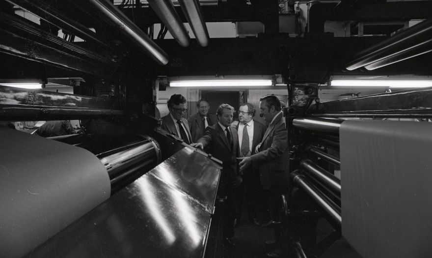This image was taken (but not used) for the Manawatū Evening Standard on 17th November 1978. Labour leader Bill Rowling toured the back offices of the Manawatū Evening Standard, speaking with staff and viewing publishing equipment prior to the 1978 General Election held on 25th November. Also present is former Labour Member of Parliament Joseph Albert Walding, who regained the Palmerston North electorate with an election night majority of 2601 in the election.