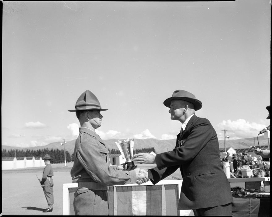 A war veteran wearing a suit and medals presents a trophy to a young soldier on the parade ground of the Linton Army Camp. This negative comes from the Elmar Collection - a large series of semi-identified and unidentified images from the 1930s-1970s.