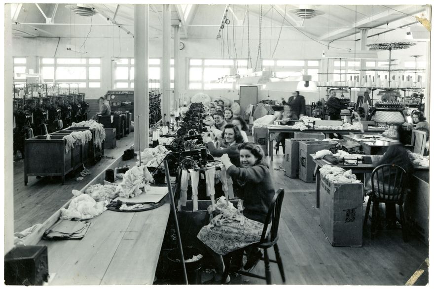 Linker's working at Jaccquard's Hosiery Mill. Patricia Butler is the fourth from the front. The Jacquard Hosiery Mills Ltd, were knitters of underwear and outerwear, that went under the brand name Jacquard. The mill at 601 Featherston Street, opened during 1949.