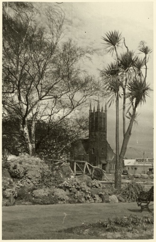 This photograph shows All Saints Church from The Lakelet in The Square. This brick structure was constructed in 1914-1915 on the site of the old wooden All Saints Church. The Lakelet was constructed and developed by the Beautifying Society in October 1909. The wooden bridge visible in front in the photograph runs across The Lakelet, which is also known as Butterfly Lake.