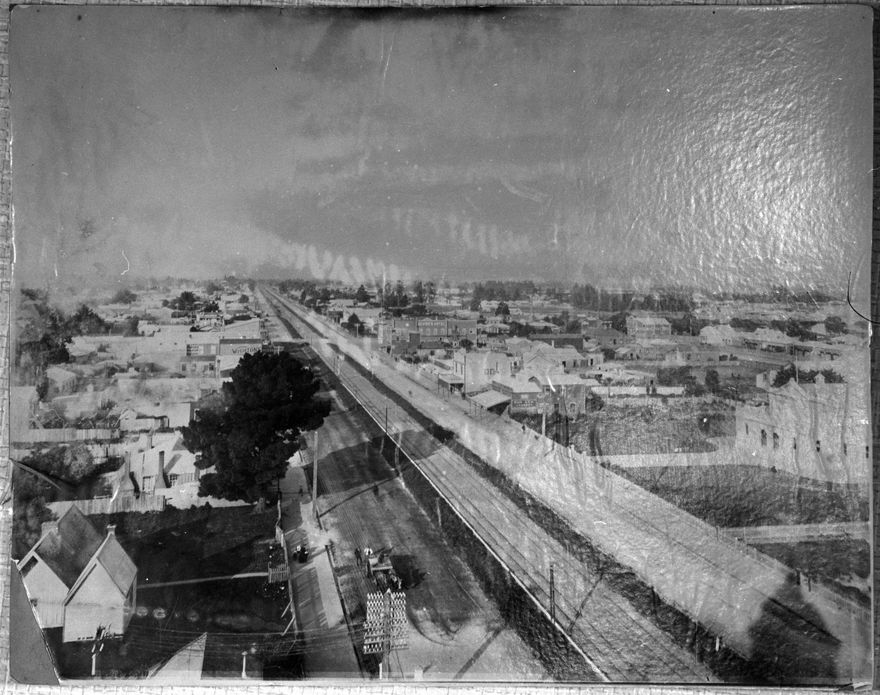 This photograph was taken from the Post Office Tower and shows Main Street East. The railway line ran through The Square and up Main Street until 1964. Despite the poor quality of this print, there is some interesting information contained, including views of Devine's Hotel [Empire Hotel], Alex M Wighton's Seed Manufacturers and Charles Dahl's hosiery factory (the word Dahl's can be read very faintly behind Wighton's). On the extreme right is the former Court House for Palmerston North.