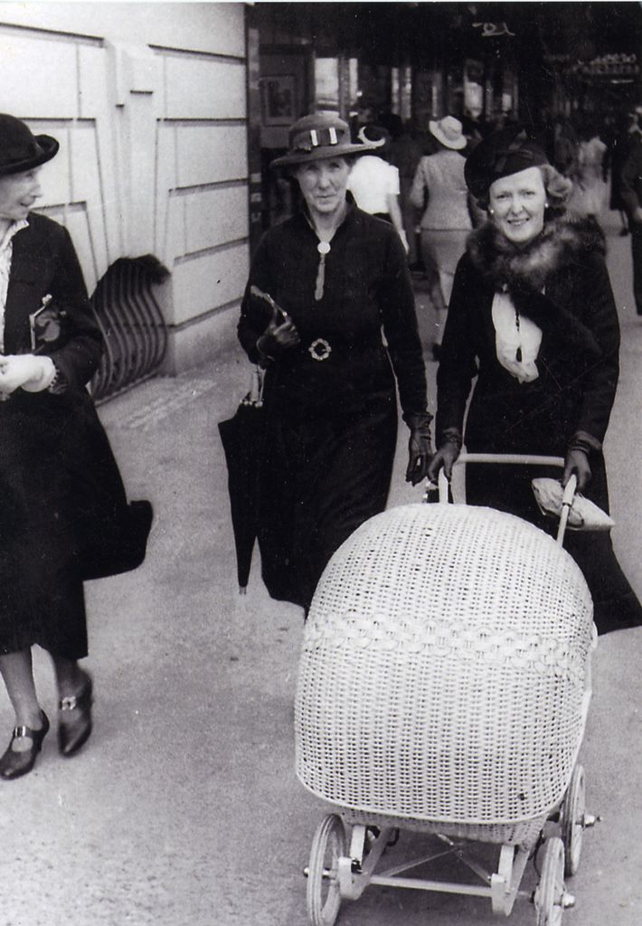 From left: Emily Hill; Edith Mechen; Ede Leyland (nee Mechen), daughter of Edith, walking along an unidentified street in Palmerston North. Emily Hill and Edith Mechen were sisters.
