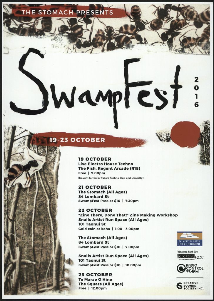 The Stomach presents Swampfest 2016. 19-23 October. 19 October Live Electro House Techno, The Fish, Regent arcade. 21 October The Stomach (All Ages). 22 October "Zine There Done That" Zine Making Workshop, Snails Artist Run Space. The Stomach (All Ages). 23 October Te Marae O Hine The Square. Part of a collection of posters that were displayed at The Stomach, Lombard Street, venue for Creative Sounds Society Incorporated.