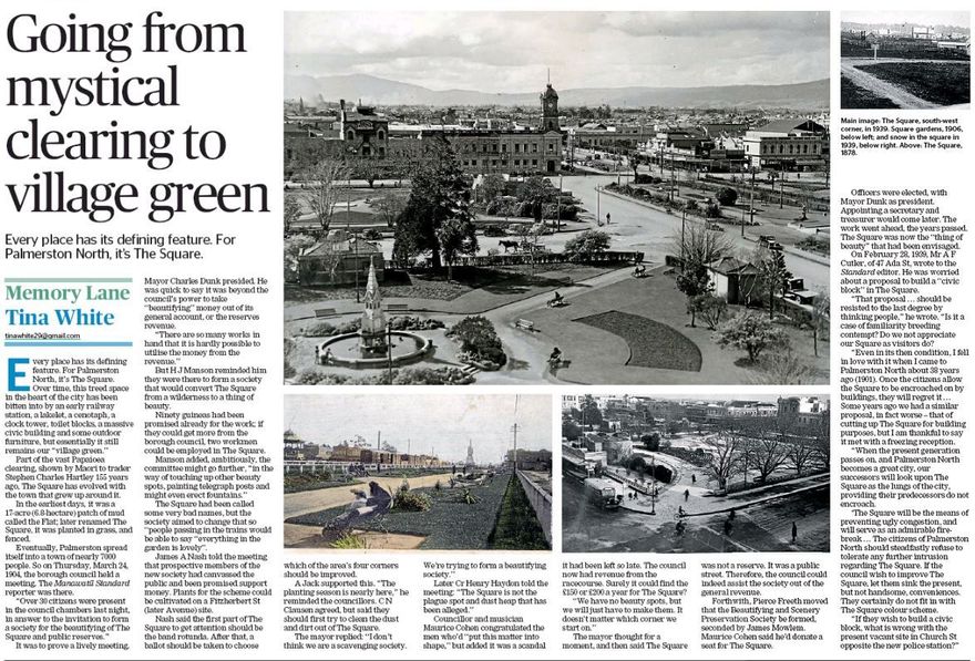 Journalist Tina White's weekly "Memory Lane" article in the Manawatū Standard. The history of Te Marae o Hine/The Square from its earliest days. The 6.8 hectare clearing at the centre of Palmerston North evolved as the town grew around it.