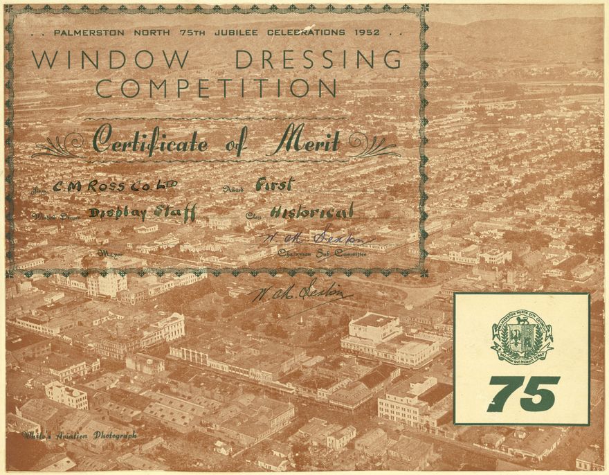 C M Ross department store display staff won first place in the Historical section of the Window Dressing Competition, held as part of the Palmerston North 75th Jubilee Celebrations. From the archive of 'C M Ross & Co Ltd'