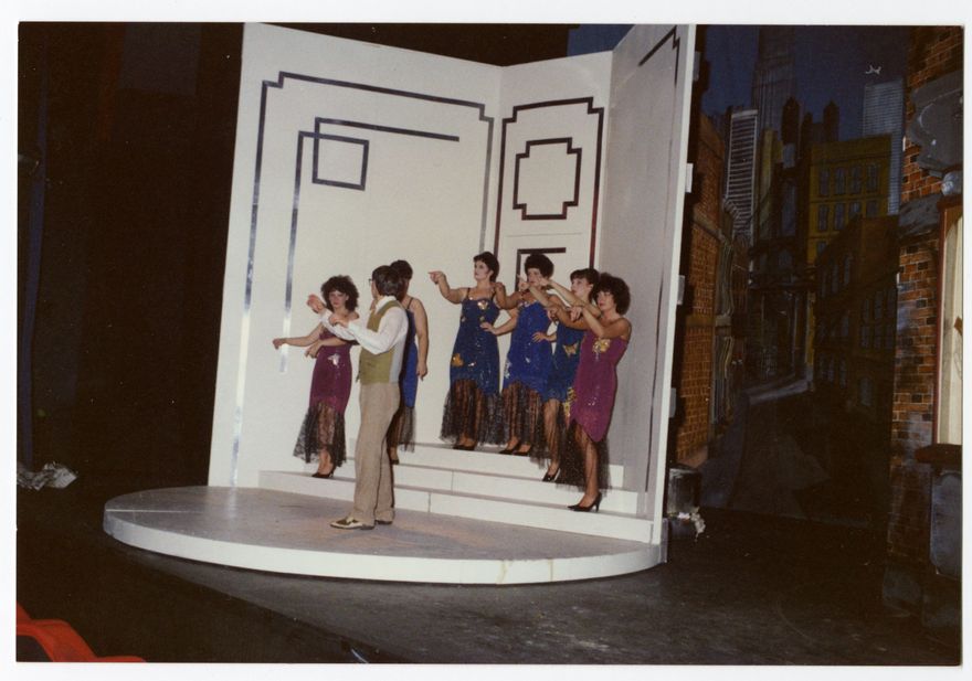 The actors involved in the Dentist musical number from the 1990 Manawatu Theatre Society production of Little Shop of Horrors, staged at the Globe Theatre. See the Little Shop of Horrors programme for information about the story, performers and support crew. Shane Collins (Cortese) stands at front.