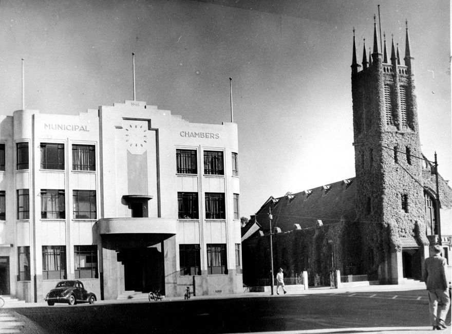 The new Palmerston North City Council Municipal Chambers were officially opened by the Mayor, Mr. A E Mansford, 13 June 1945. They were designed by Reginald Thorrold Jaggard and built on the site of the former civic administration building. Today the building houses an arts and cultural centre and is called Square Edge. The All Saints Church was the third on this site, built in 1914.