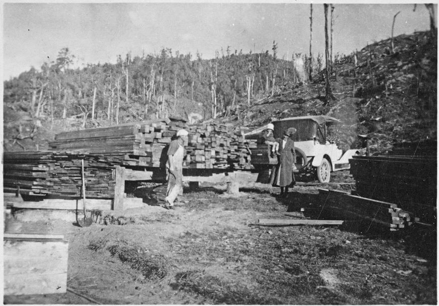 Foot's mill was the last sawmill to cut timber on the northern Tararuas. It was situated on the top of Forest Hill Road, Fitzherbert East and operated from 1920-1927. The people in this photograph are Mr W H Foot (left), Mrs Foot (right) and their son William (centre).