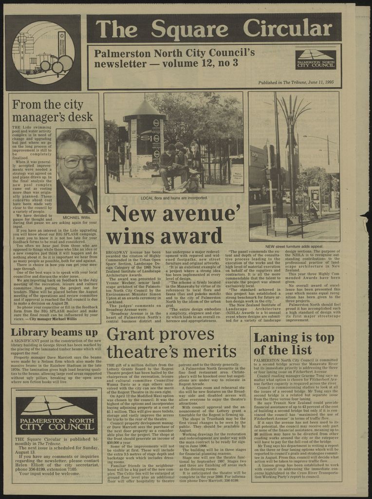 The Square Circular was Palmerston North City Council's monthly community publication, informing Palmerstonians of PNCC initiatives, activites, and events. This month's issue includes: Michael Willis; Broadway Avenue; Fitzherbert Avenue; Church Street; library; Regent theatre; art gallery; Science centre and Manawatu museum; Fitzherbert Park; community leisure centre; mid winter festival; parking; computers for schools; liquor licensing; damp homes; fireplace installation; VE day remembrance; environmental trust; elections; meetings.