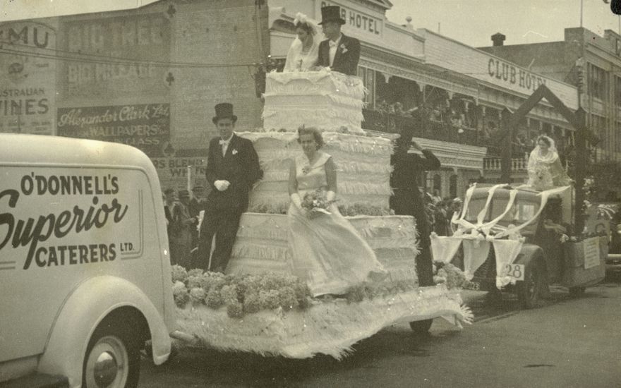 O'Donnells delivery truck towing a wedding cake themed float in the Jubilee celebrations parade, on Church Street, Palmerston North