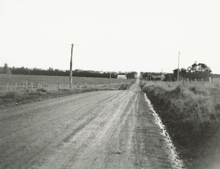 Kelvin Grove Road, Palmerston North, facing west from Roberts line intersection before the Whakarongo Deviation went through. Kelvin Grove Hall is in the centre of this photograph.