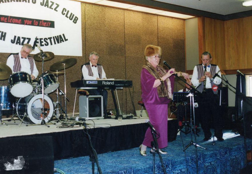 Superants performing at the 25th Annual Manawatū Jazz Festival. L-R: Jim Morrell (drums) Robin Mitchell (keyboard) Bet Steele (vocal) unidentified (guitar) Jack Steele (clarinet)
