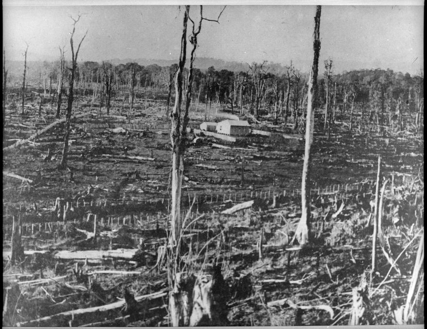 This photograph shows the property of Charles Neilson, No 1 Line, Awahou North, Pohangina Valley with a vivid reminder of the harsh landscape left behind by recent bush felling.