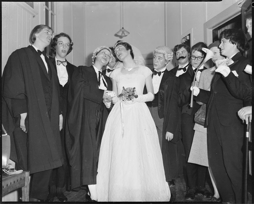 This image was taken for a story that ran in The Manawatu Evening Standard on 18 August 1960 "Some members of the cast from "Trial By Jury" staged by the Palmerston North Girls' High School in their assembly hall last night, are seen preparing prior to going on to the stage. The bride was played by C. Sanders and the judge on her right was played by A. Schamroth."
