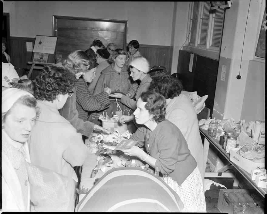 This image was taken for a story that ran in The Manawatu Evening Standard on 06 October 1960 "Stalls at the Y.W.C.A. Spring Fair yesterday afternoon were quickly sold out within a short time of the official opening. A portion of the large crowd which attended is seen here"