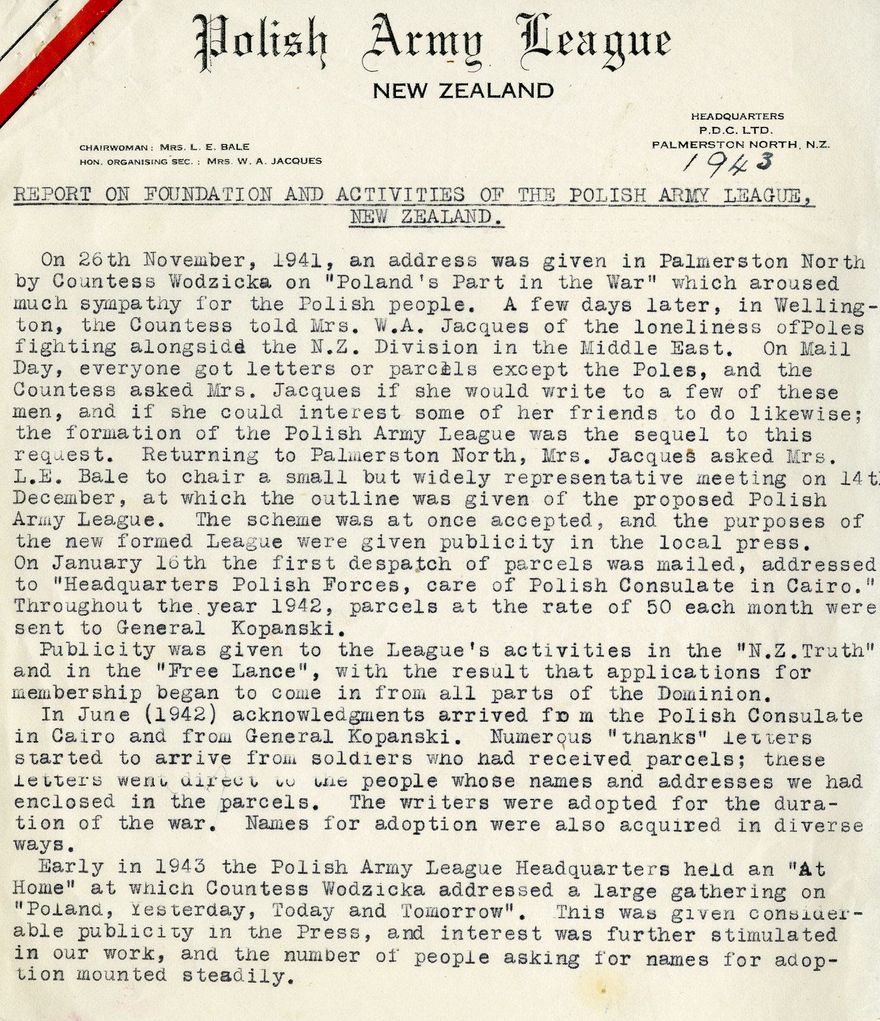 Report produced by the Polish Army League on its history and activities, on letter head paper. Includes the names of other organisations, particularly locally, who have worked for the cause. Also includes some extracts of letters received from Polish Forces. The Polish Army League, founded in Palmerston North in WWII, corresponded with and sent parcels to Polish soldiers who served with the allies in World War Two.