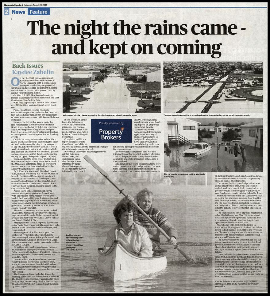 Local historians weekly "Back Issues" article in the Manawatū Standard. On July 24 1988, the Mangaone and Kawau Streams flooded a large area in Palmerston North, triggering a civil defence emergency which was to last for four days. More than one thousand evacuees spent a night at the Convention Centre. The Palmerston North City Council commissioned a Comprehensive Stormwater Plan in the aftermath, as it recognised that learning from past flood events is critical to ensuring we are ready to face the next one.