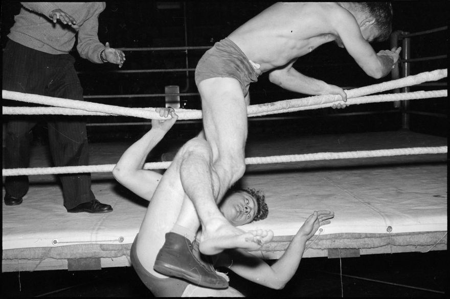Caption: “The bout voted the most entertaining of the night was between B. Mudgway (British Empire lightweight title holder) and J. Gosling. In the photo above the fight seems to have moved outside the ring.”