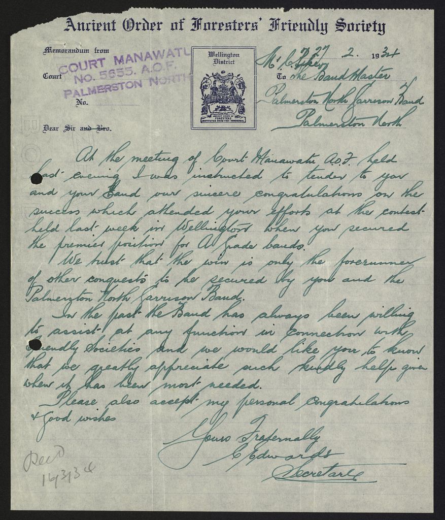 Letter from the Ancient Order of Foresters' Friendly Society, congratulating the Palmerston North Garrison Band on their success at the Band competition in Wellington, where they won the A Grade. The letter is signed by C Edwards, Secretary. The letter is from the Palmerston North Garrison Band archive