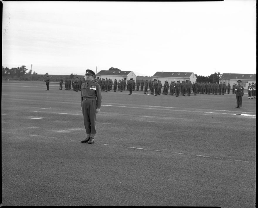 An officer wearing medals stands at attention on the parade ground of the Linton Army Camp. Behind him are a group of army personnel standing in formation. This negative comes from the Elmar Collection - a large series of semi-identified and unidentified images from the 1930s-1970s.