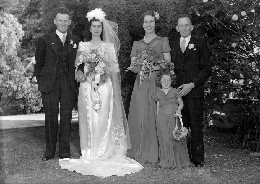 A photograph of the Hansen wedding party, including bride, groom, bridesmaid, groomsman (or best man) and flower girl.