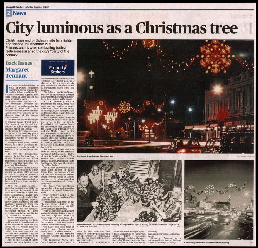 Local historians weekly "Back Issues" article in the Manawatū Standard. Special "Regent Street" London made street lights celebrated both the Palmerston North centennial and Christmas in 1970. The lights were hung in Broadway Avenue, Rangitikei Street and in the streets around Te Marae o Hine/The Square. The lights were displayed each festive season until 1975.