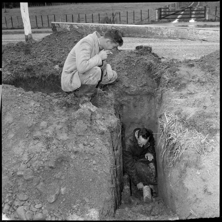 This image was taken for a story that ran in The Manawatu Evening Standard on 22 June, 1963. "It is hard on feet and hands working in mud and slush conditions on cold mornings as these Post Office Department employees well know. Here they are seen laying pipes for re-routing telephone cables under the Manawatu bridge road. Two cables serve the micro-wave station and two others the Linton-Fitzherbert area."