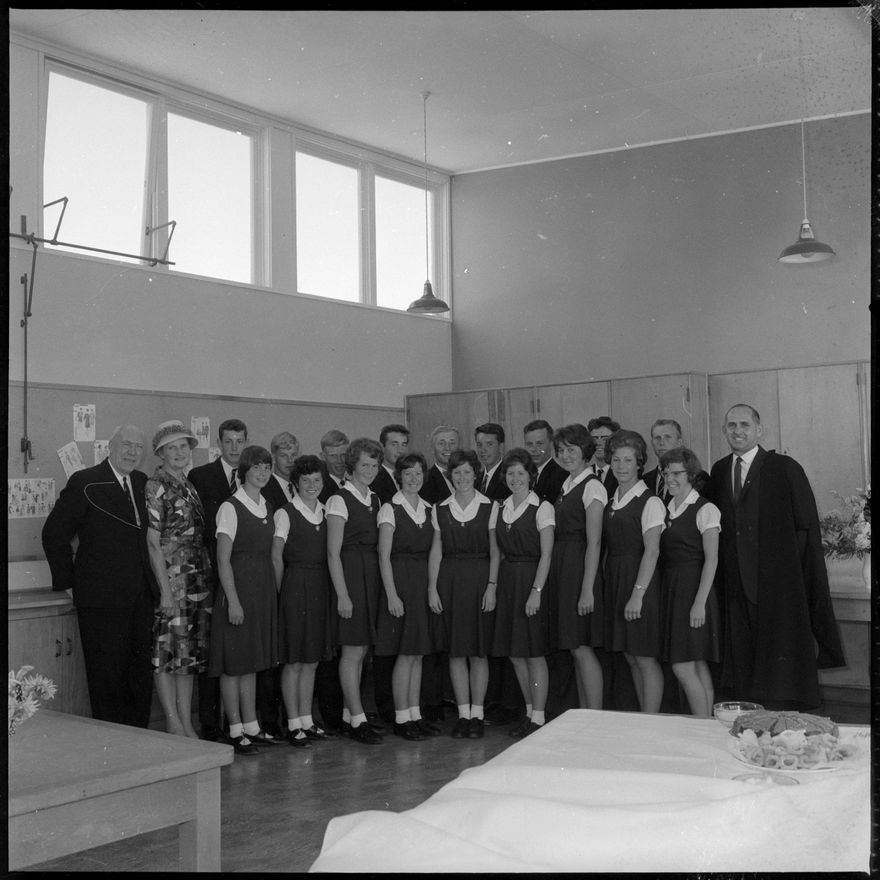 This image was taken for a story that ran in The Manawatu Evening Standard on 17 February, 1964. "The prefects appointed at Freyberg High School. They are (from the left): Back row, C. B. Bull, A. Davidson, P. W. Loveridge, B. W. Bowler, P. L. Nicolle (head boy), J. Lucas, K. G. Tester, G. C. Woodhead; front row, S. M. Gregory, R. A. Hunt, H. M. McKenzie, J. E. Hooper, J. S. Hooper, J. M. Hooper, S. Nicholls, F. Y. Pootjes, R. E. Trollope. On the extreme left is Mr E. Blechynden, chairman of the High Schools' Board of Governors, and Mrs Blechynden. On the extreme right is Mr M. Print, principal of the school."