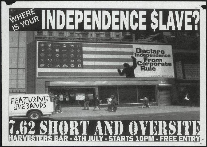 Where is your independence $lave? Declare Independence from Corporate Rule. Featuring live bands. 7.62 Short and Oversite. harvesters Bar. 4th July. Starts 10pm. Free entry. Part of a collection of posters that were displayed at The Stomach, Lombard Street, venue for Creative Sounds Society Incorporated.