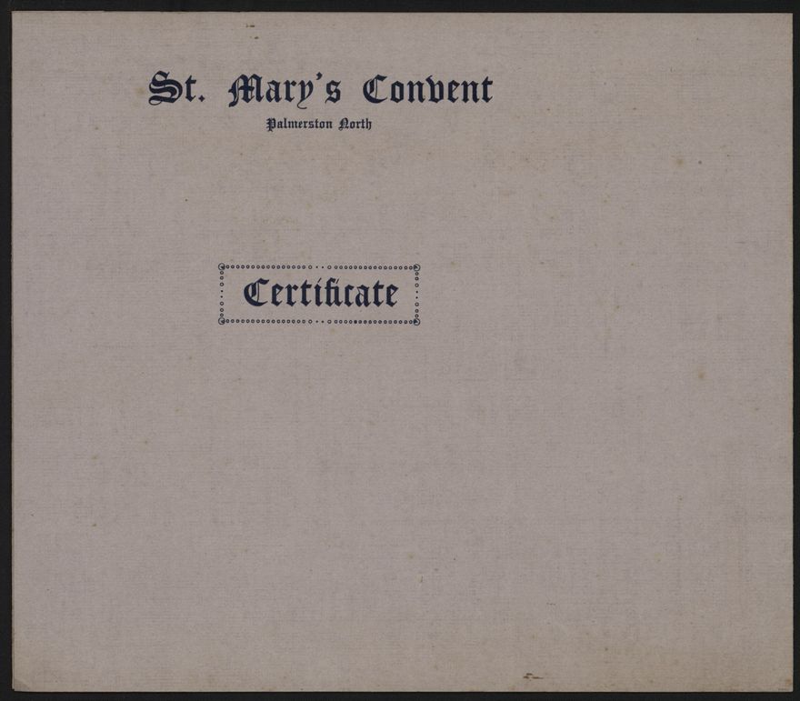 Certificate from St Mary's Convent School awarded to Cora Barlett for merited pass prize from qualifying paper.
