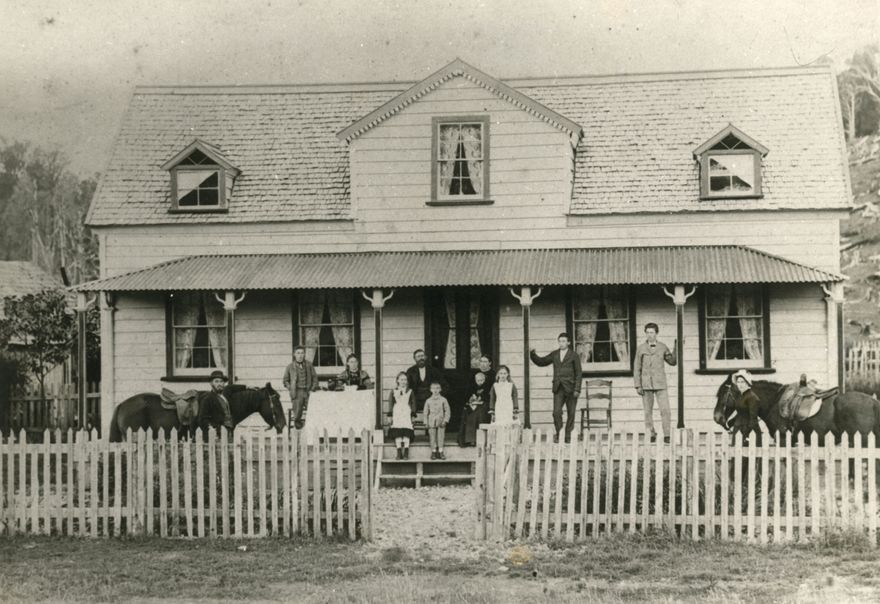 Jens Larsen is shown here with his family outside their second house in Mauriceville West. Larsen, who built this house himself, also made and played violins. On one celebrated occasion he even improvised a concertina.