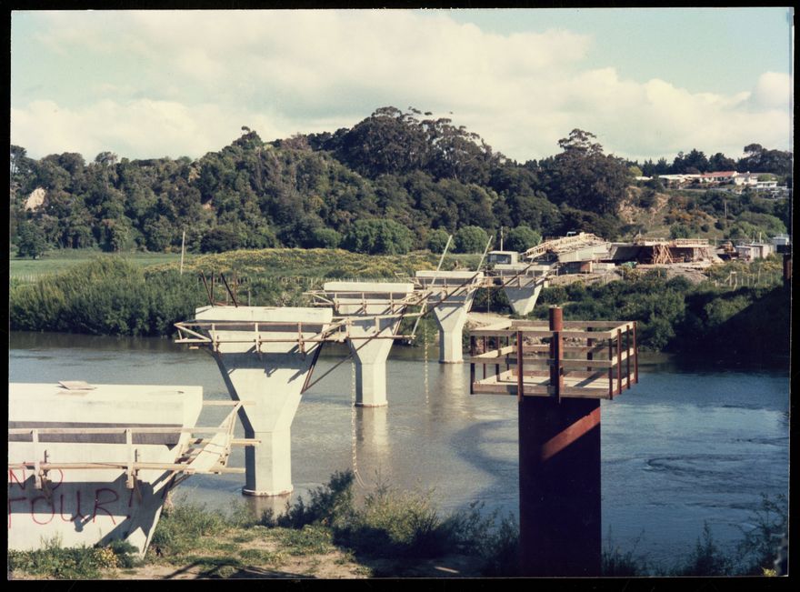 A bridge was first built across the Manawatū River in 1877, linking Palmerston North with the Fitzherbert area. The second bridge was constructed between 1933 - 1935 and remained in place until 1986 when it was replaced by the bridge being constructed in this series of photographs.