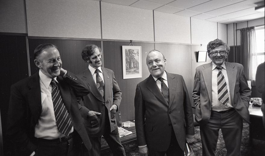 This image was taken for the Manawatū Evening Standard on 17th November 1978. Prime Minister Rob Muldoon visited the Manawatū Evening Standard offices, prior to the General Election held on 25th March 1978. Muldoon toured the country in the days leading up to the election, sometimes encountering hecklers and abuse outside planned events. During his visit to Palmerston North, he announced intentions to reimpose wage controls if unions continued strike action. Although the National Party won the election with a reduced majority, local electorate seats changed hands, with Labour's Joe Walding regaining the Palmerston North electorate from John Lithgow, and Social Credit's leader Bruce Beetham regaining the Rangitikei electorate from National's Les Gander.