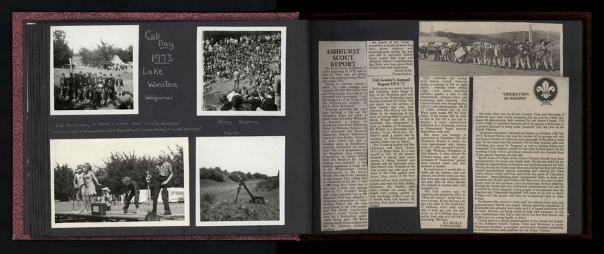 A variety of activities are shown in the photograph album created by the Ashhurst Scout Group, including examples of bush craft, a handicraft expo, games and several Field and Cub Days. Group photographs are also included.