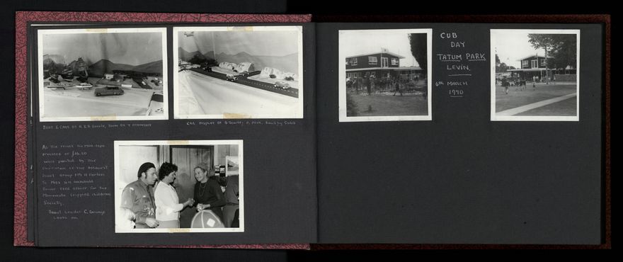 A variety of activities are shown in the photograph album created by the Ashhurst Scout Group, including examples of bush craft, a handicraft expo, games and several Field and Cub Days. Group photographs are also included.